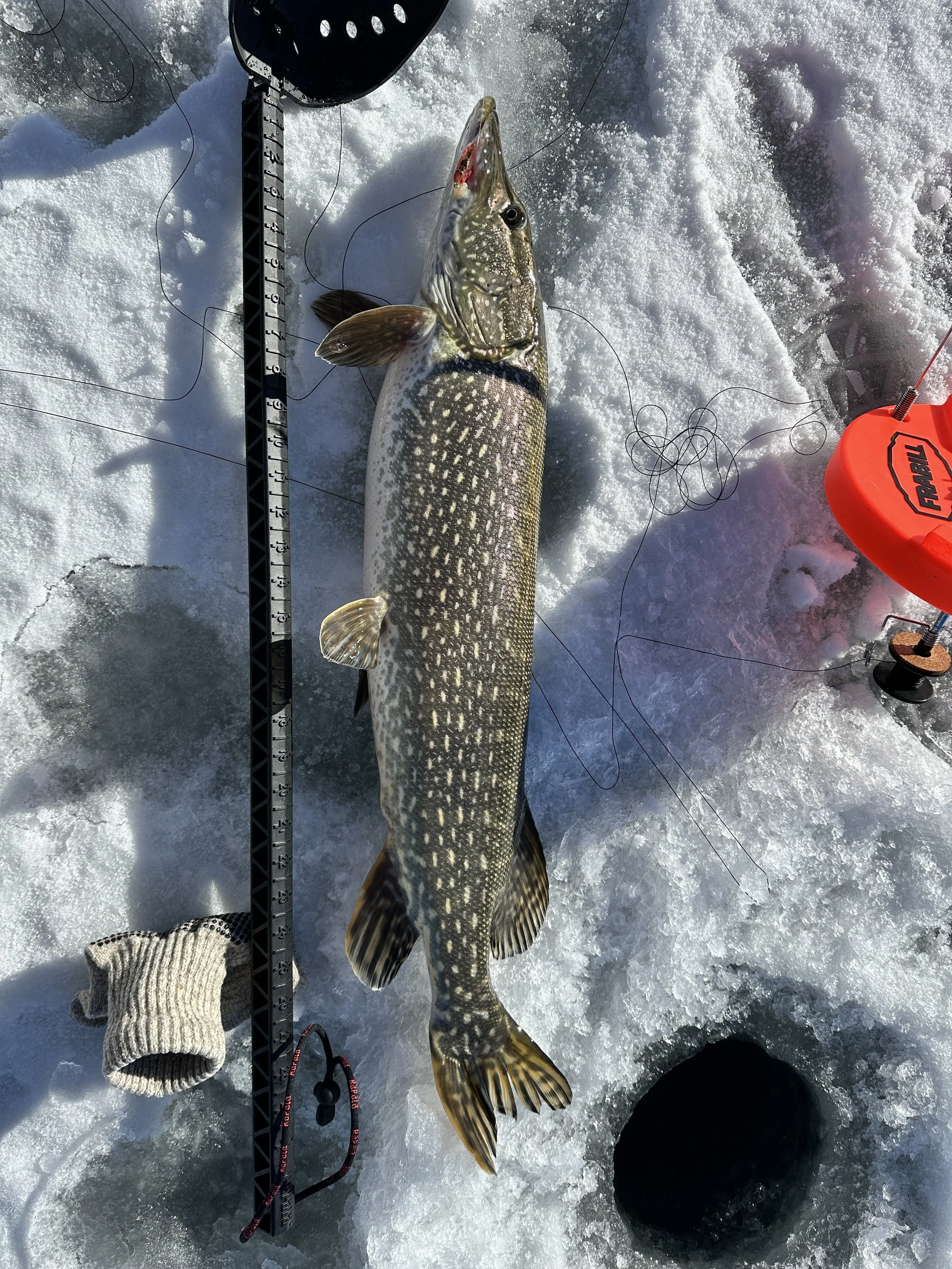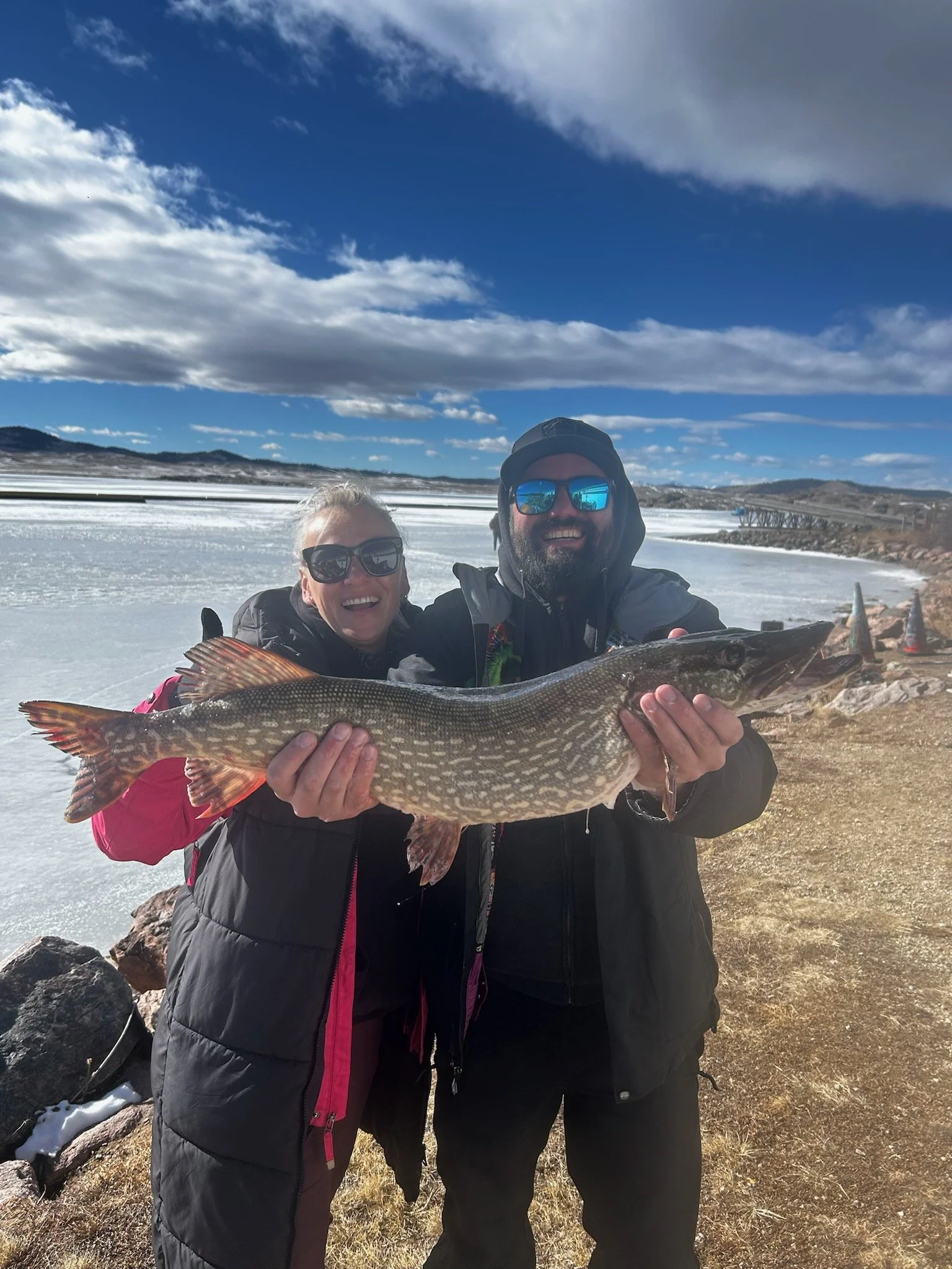 PIC # 5: “Hi, I came in this morning looking for suggestions on how to get a pike near coyote ridge (tall blonde dude) and I just got one using the advice of the two folks working. So thank you! This was my first pike on the tipup. Rigged up water dog with predator rig. 7’ of water probably a foot or so off the bottom. Probably 31-32” pike You guys are the best!- Joe” pic and report courtesy Joe