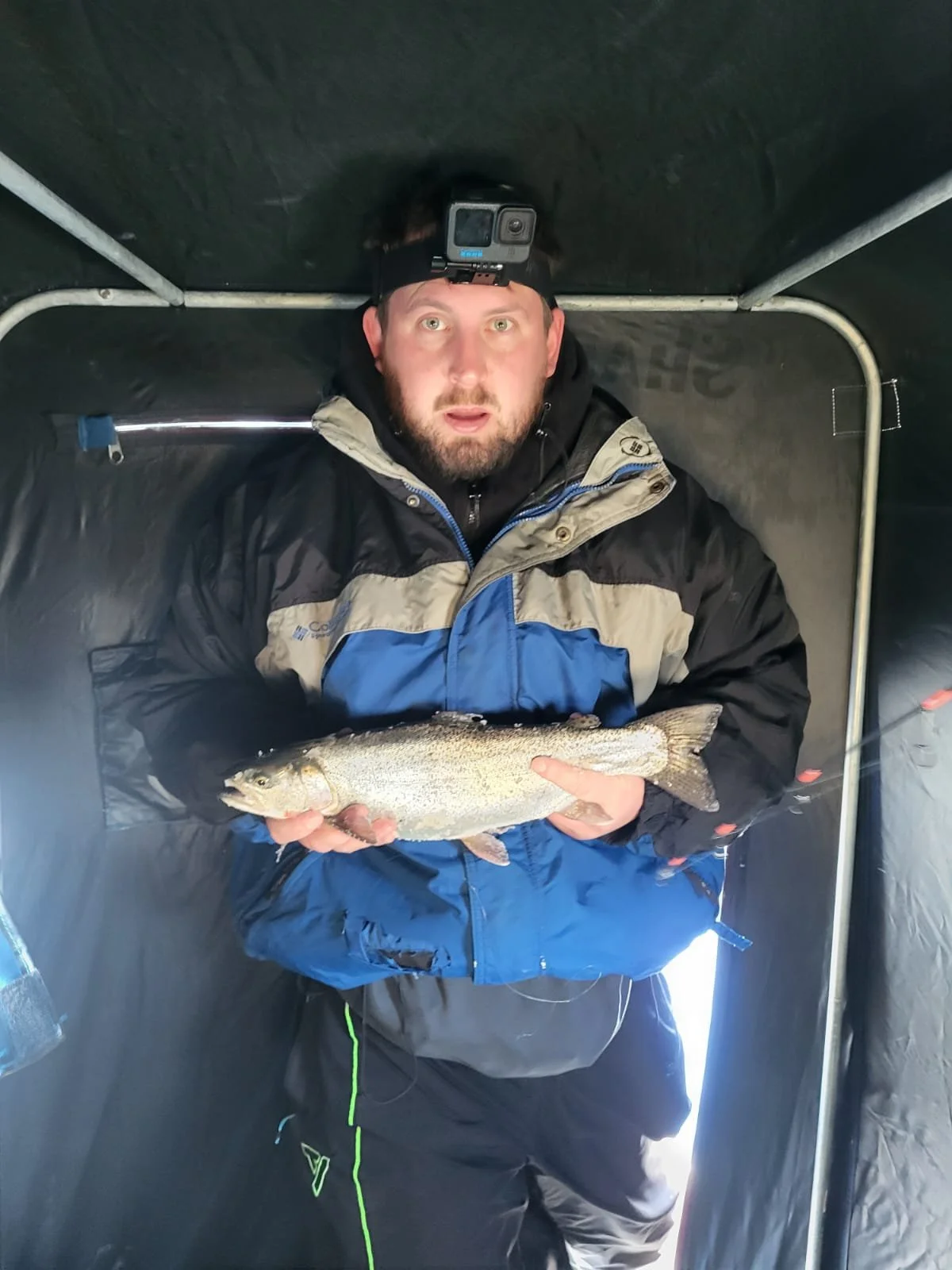 PIC # 4: “Out at rocking chair about 17ft of water. Clear green tube jig with wax worm. About 18in caught 2 of them. Seeing fish all over the place. Alot of them were shallower but we couldn't move the shanty due to the wind today.” pic and report courtesy Dillion C.