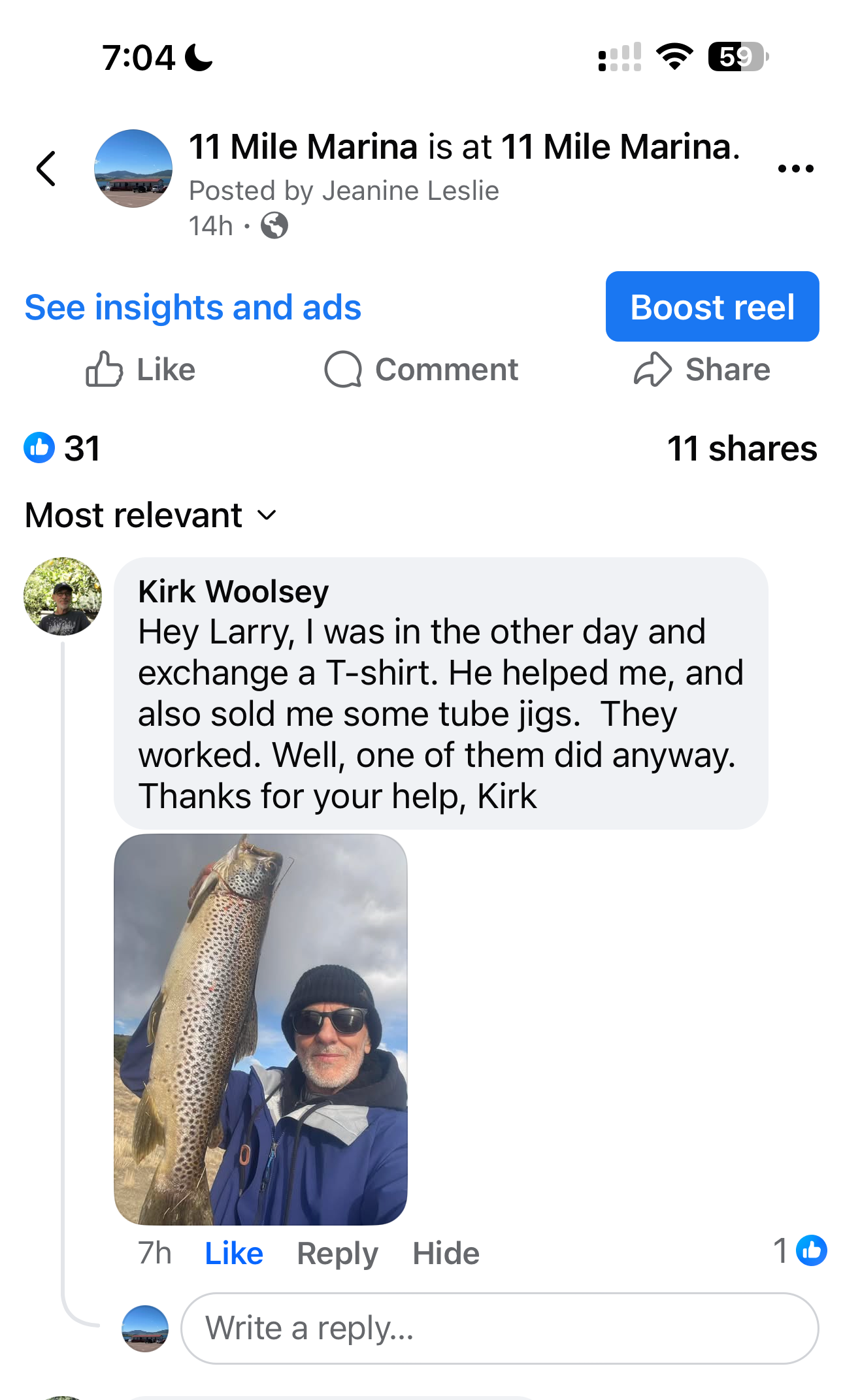 TROUT: GOOD: Action has been steady. Ice off action should go on a little longer. Cuttbows in spawn mode. Browns are active. Look to the tackle box and change up frequently if need be. We really like tube jigs this time of year. Marabou jigs also one of our favorites. Just got in a bunch of new tubes and Marabous should be here any day. We don’t necessarily rush out on a boat when the lake opens. Have been doing great from shore on big fish particularly at sundown until it’s dark and you can’t hardly see. Rapala’s and Kastmasters also a hot ticket look to Leach and egg patterns on the fly and night crawlers don’t let you down.