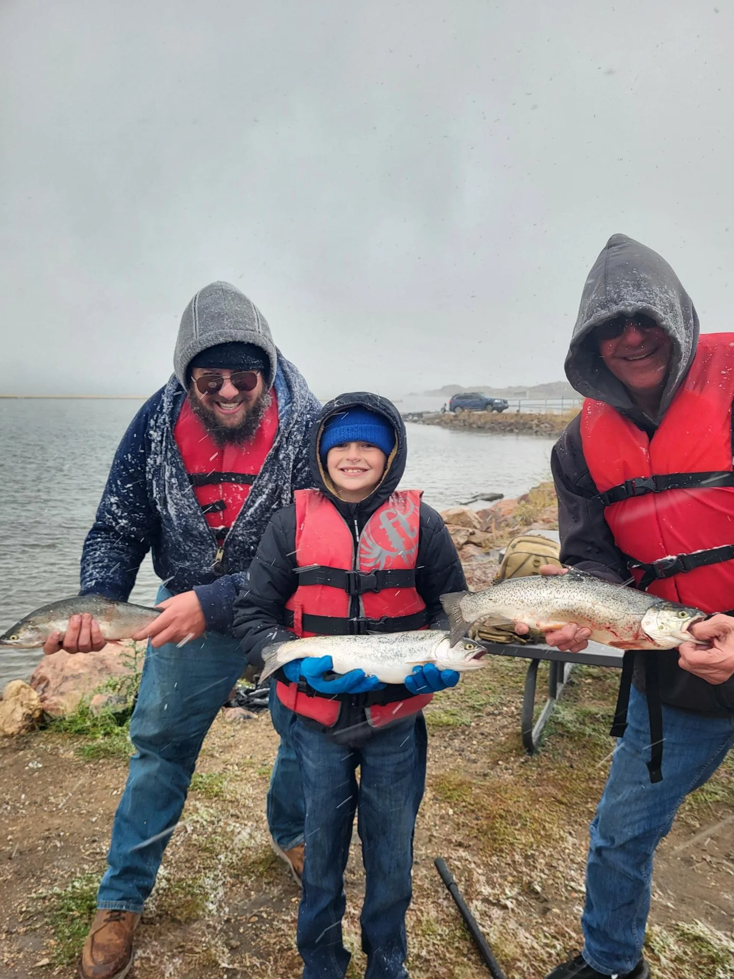 PIC # 1: Michael took his Dad and son out on a Lund rental October 13. The weather was nasty if you don’t like cold and snow and we were prepared to refund their rental. Most folks showed up and left instead of braving the elements. These guys were determined. They had never been here before and had limited boating experience. Wind wasn’t too bad so the went for it. We gave them instructions to hide out in Corral Cove fishing worms and pitching Kastmasters. The snow flurries that were predicted turned into a snow storm for a while and there were white out conditions. We were a little worried about them but then they appeared out of the clouds and snow and made it in with BIG smiles. They said they had none stop action and were too excited to feel the cold until they got back. They warmed up in the store and told us their stories. His young sone will never forget the memories they caught that day.